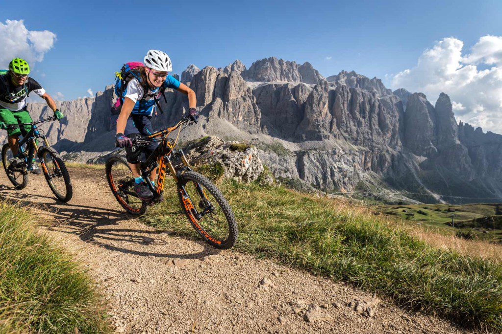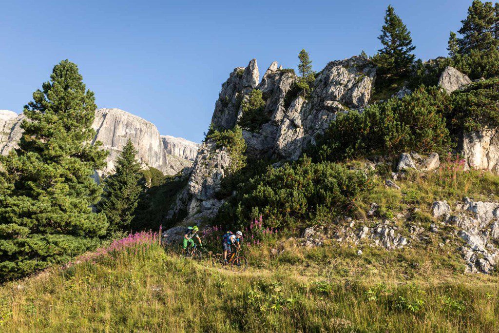 Auch für die Sella Ronda empfiehlt sich ein Guide. „Wir werden über den Tag hinweg einige Trails fahren, die in keiner Karte zu finden sind“, verspricht uns Klaus. Unzählige Varianten in allen möglichen Schwierigkeitsgraden sind möglich, die auf jede Gruppe angepasst und so zu einem individuellen Erlebnis verknüpft werden können. Finanziell gibt es ebenfalls keinen Grund, sich nicht auf das Wissen der Profis zu verlassen. Gerade einmal 10 Euro mehr kostet die Tour mit Guide, als wenn man die Karten selbst kauft. Tipps und Ideen für weitere Touren und Informationen über Land und Leute gibt es gratis obendrauf.