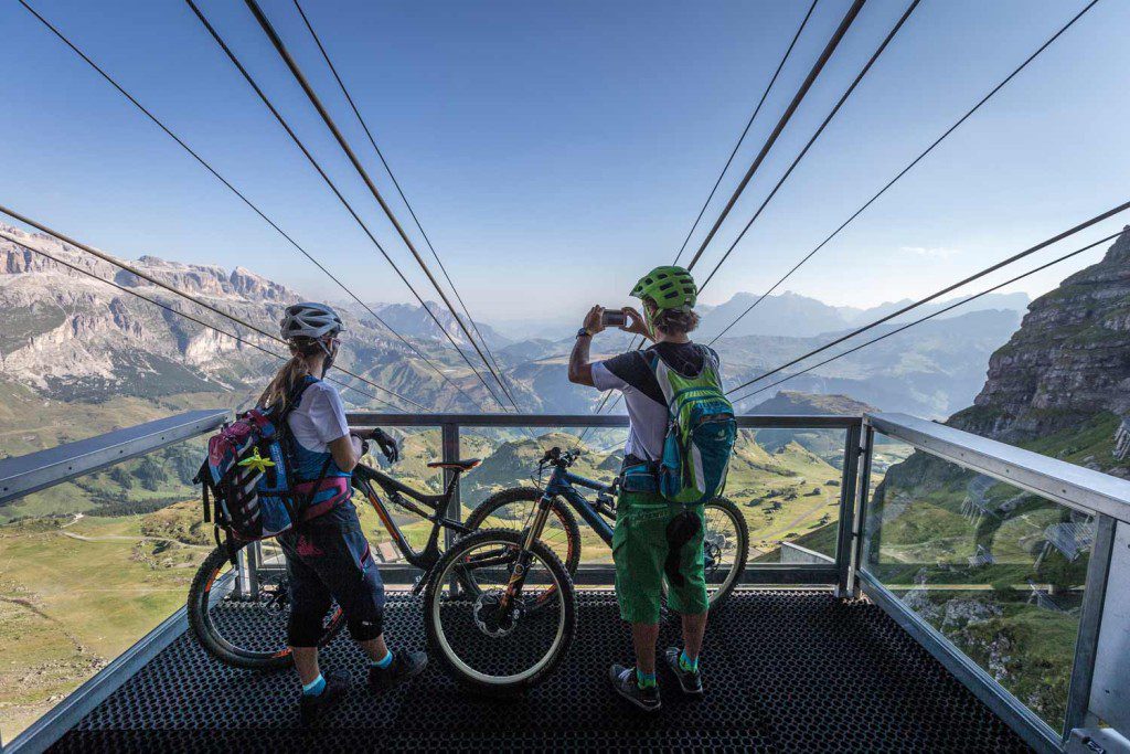 Wir haben uns bei der Umrundung des Sellastocks für den Uhrzeigersinn entschieden. In dieser Richtung ist es möglich, mehr Seilbahnen zu benutzen, und wir müssen bergauf weniger Höhenmeter selber treten. Auch können fahrtechnisch anspruchsvollere Trails in dieser Fahrtrichtung verknüpft werden. Möglich ist aber Beides, je nach Gusto. Wir haben eh das Gefühl, dass hier für Radfahrer fast alles möglich ist. Die meisten Seilbahnen laden die Bikes gerne ein. Trails wurden parallel zu den Fußwegen gebaut, und so ist sichergestellt, dass die Interessen der Wanderer und Biker gewahrt werden. Einmal im Jahr wird sogar die ganze Sella Ronda für den Strassenverkehr gesperrt und bleibt den Radfahrern vorbehalten. Am „Sella Ronda Bike Day“ heisst es dann: Kein Lärm, kein Verkehr, nur die 56 km, die vier Pässe und wahrscheinlich 22’000 Radfahrer!…