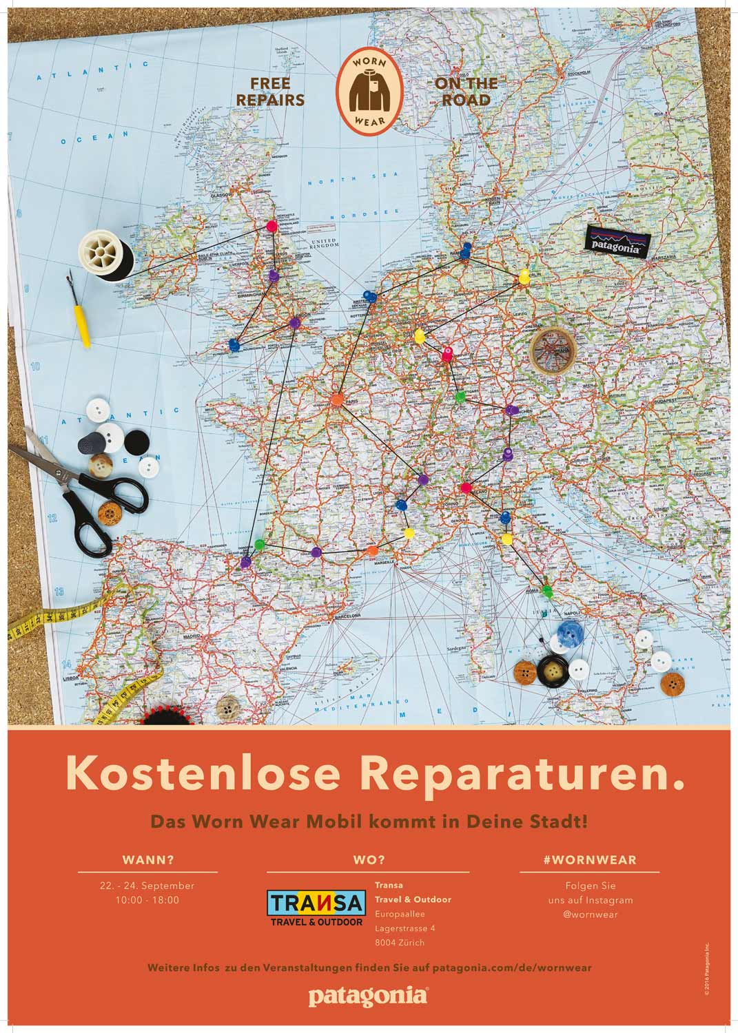 Nach der erfolgreichen Tour durch Europa im April dieses Jahres, ist Patagonia stolz, seine Mission mit 5 Stationen in der Schweiz weiterzuführen, die dem Kunden dabei hilft, seine Kleidung (egal welcher Marke) ein Leben lang zu nutzen. An jeder Station werden Reißverschlüsse, Risse, Löcher und andere Schäden kostenlos ausgebessert und man erfährt, wie man seine Kleidung selbst reparieren kann.